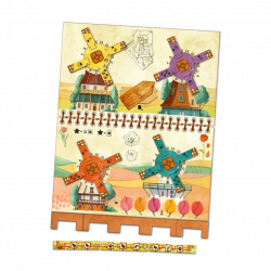 Libro de aventuras, 6 cajas, 4 indicadores de jugador, 74 cartas, 1 dado, 172 fichas, 4 tableros de arroyo, 4 discos de molino magnéticos, 1 dial de rosa de los vientos magnético.