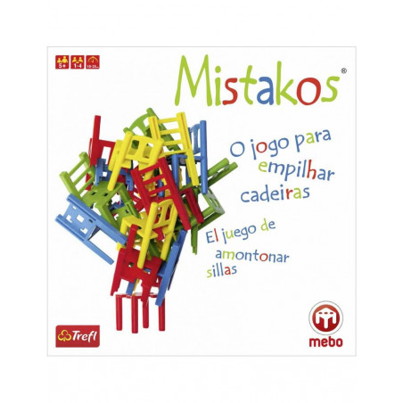 Durante este divertido juego de Mistakos cada jugador intentará apilar el mayor número posible de sillas. Sólo una puede tocar en la mesa ¡Cada jugador tiene que tener mucho cuidado de no hacer caer unas cuantas sillas o incluso toda la pila en su turno!