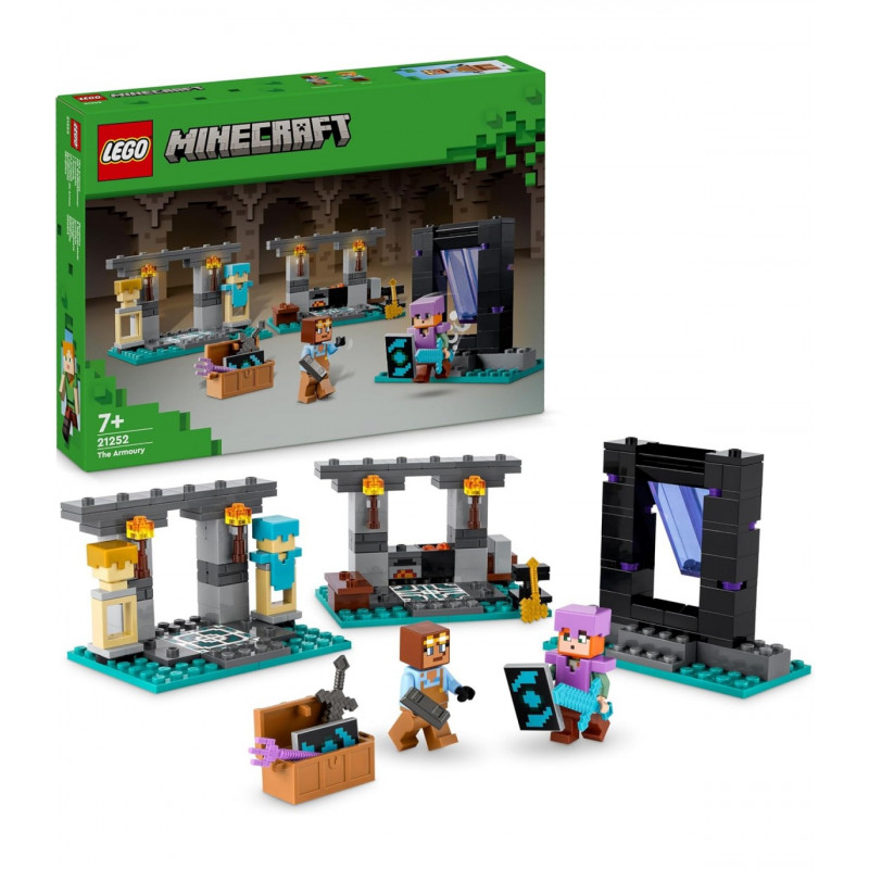 A los jugadores de Minecraft® de 7 años o más les encantará jugar en el mundo real con los elementos y las armas Minecraft del set La Armería (21252). Este kit de construcción LEGO® Minecraft, una fantástica idea de regalo para niños y niñas, les ofrece la puerta de entrada perfecta a las aventuras Minecraft. Este juguete infantil construible incluye 2 conocidas figuras: la heroína de acción Minecraft Alex, con su escudo y su espada de diamante, y el armero. Puedes explorar 3 entornos: la zonade trabajo, con un yunque, un horno, una piedra de afilar y un caldero lleno de lava; la sala de exposición de armaduras, cuyo cofre contiene un hacha dorada, un tridente encantado, una espada de netherita, un casco y otros recursos Minecraft; y el portal del Nether, con su entrada de puertas batientes hacia la nueva aventura de los jugadores. El juguete Minecraft puede combinarse con otros sets LEGO Minecraft, como La Emboscada en el Portal del Nether (21255), a la venta por separado.